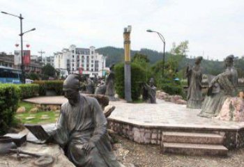 該景觀雕塑呈現(xiàn)男子單腿站立、奮力托舉胖娃的場景,一旁還有小狗互動,造型充滿動感與趣味,為環(huán)境增添活力與藝術(shù)氛圍。